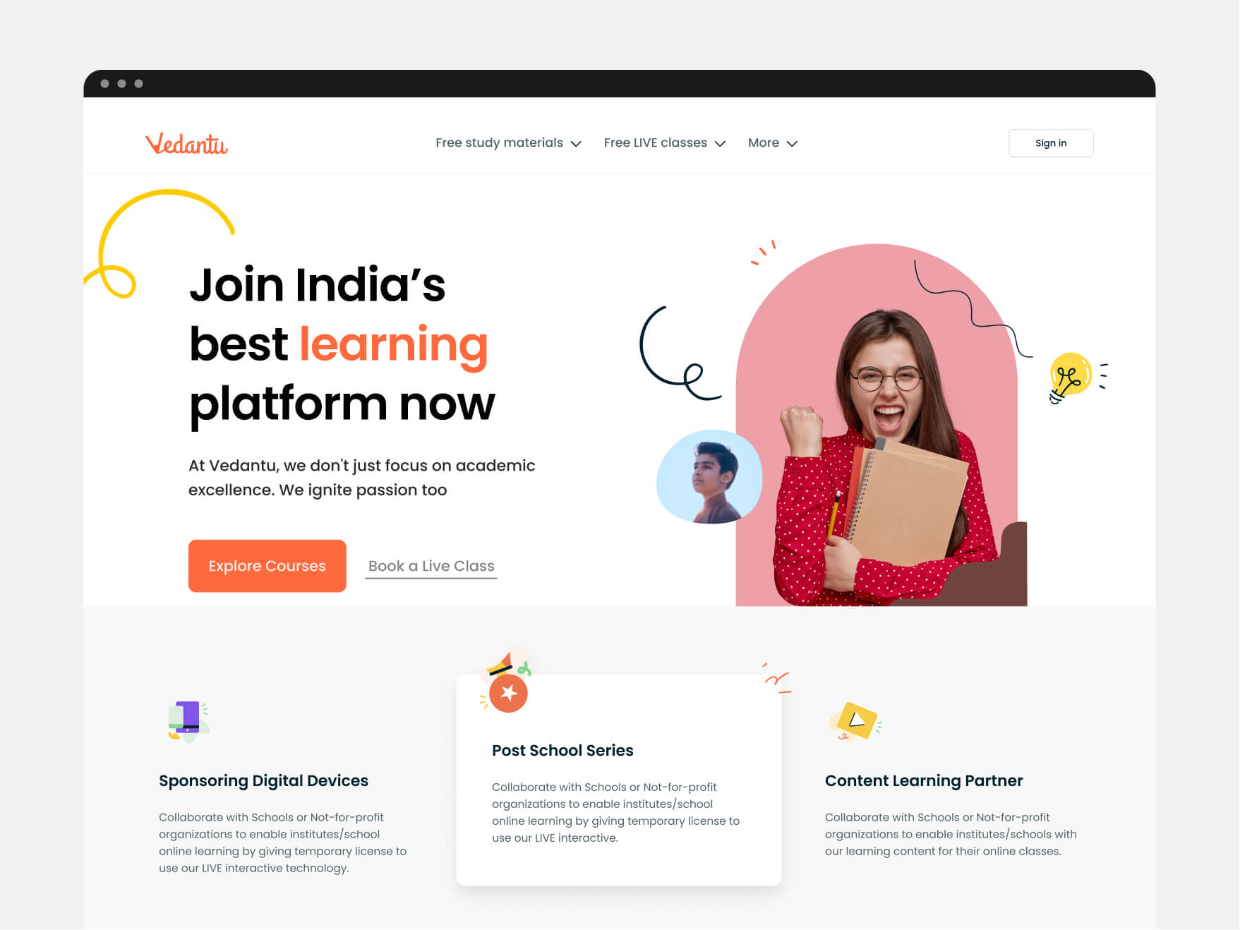 Vedantu is a widely known brand in the global market and was recently named a unicorn. Make sure to keep the roots of the original features and USPs while making it modern & playful. Increase the conversion rate from the old website.